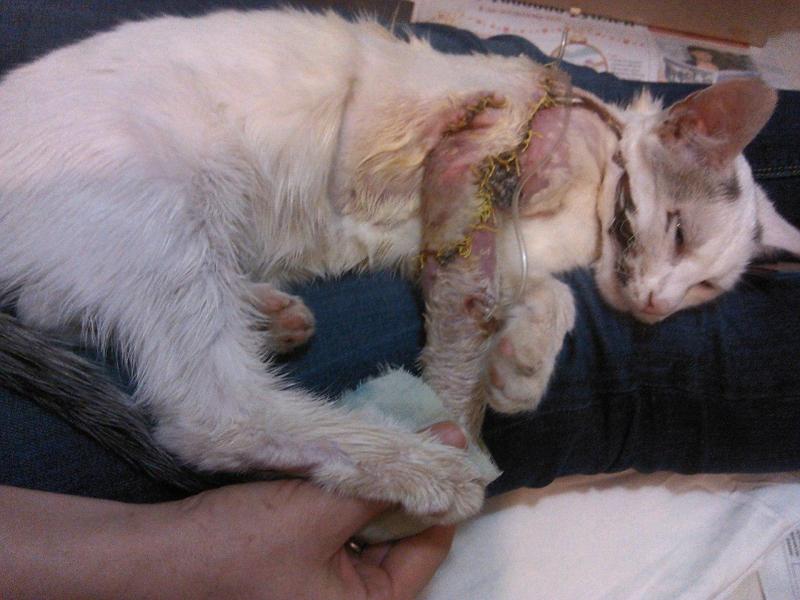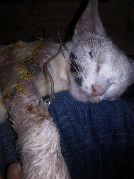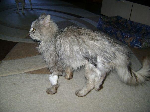 Читать всю историюПодобрали в первых числах апреля на проспекте Ленина 14. Вся лапа была разорвана, кожа свисала и было загноение. Сердце дрогнуло, подобрала… спасибо проходившей мимо паре, помогли поймать. Отвезла в ветеринарку на К.Иванова, когда врач увидел котенка, первое что сказал: – только ампутация. Начали обсуждать, что да как… решили, что попробуют оперировать, если не получиться, то ампутируют.